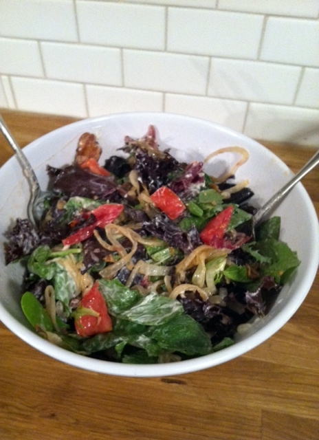 In an effort to use up the remaining tomatoes from the summer harvest, I made this salad. It really does taste like a BLT. The tangy dressing is a cross between Caesar and Ranch.