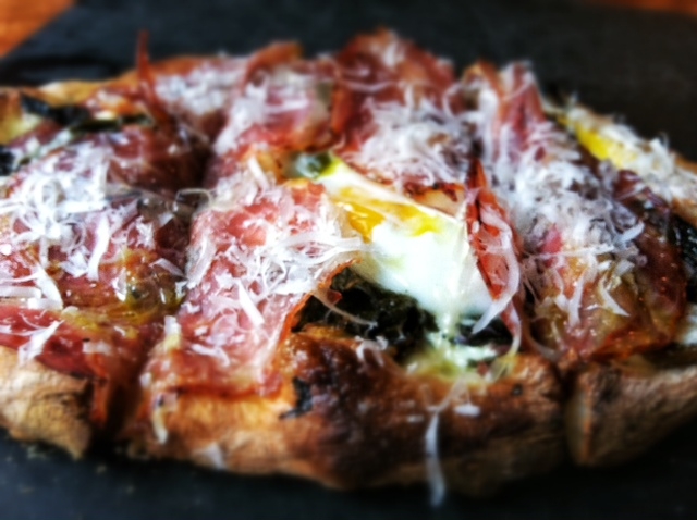 Duck Egg, Coppa and Garlicky Greens Pizza