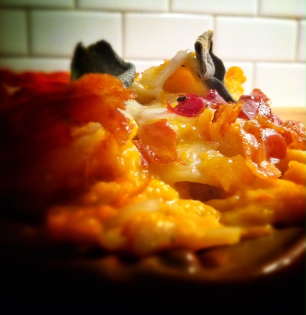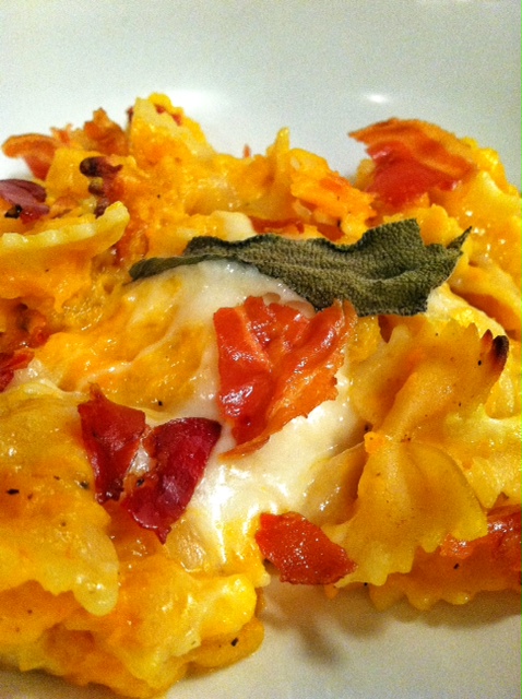 Spray an 8 or 9 inch casserole dish. Fill with pasta mixture. Top with grated mozzarella and parmesan Arrange 6-8 fresh sage leaves on top. Bake 25-30 minutes until cheese is golden and bubbling. Serve and top with crumbled Pancetta.