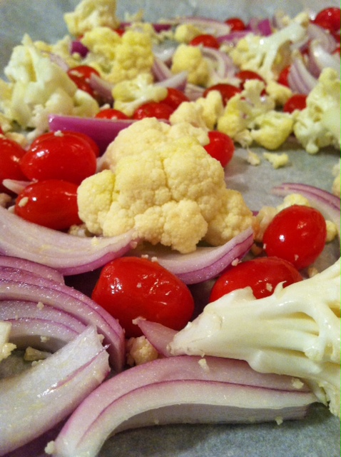 In a large bowl, combine, cauliflower, tomatoes and onion with the olive oil. Season with salt and pepper. Roast on a large parchment lined baking sheet for 20 minutes.