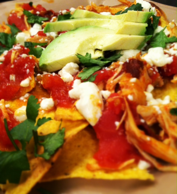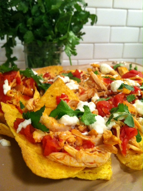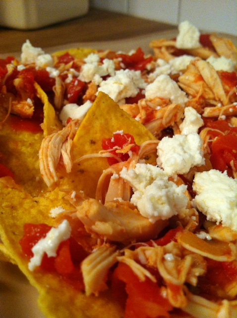 Top the chips with the chicken/tomato mixture and crumble with cheese. At this point I pop the plate into the oven for a few minutes to get the cheese melty.