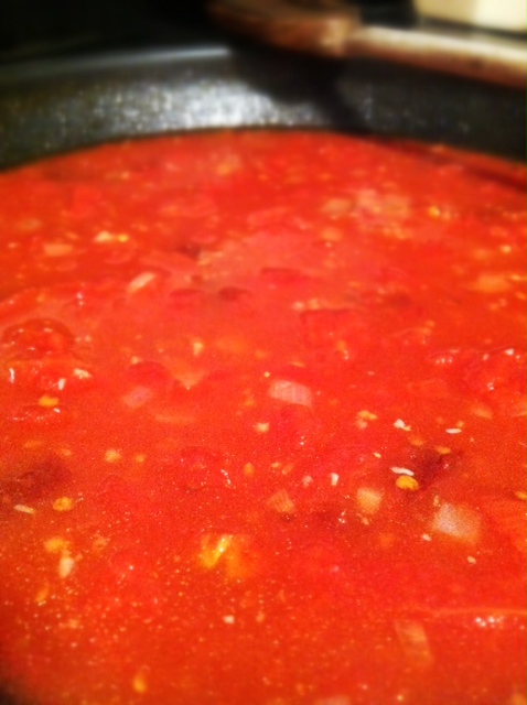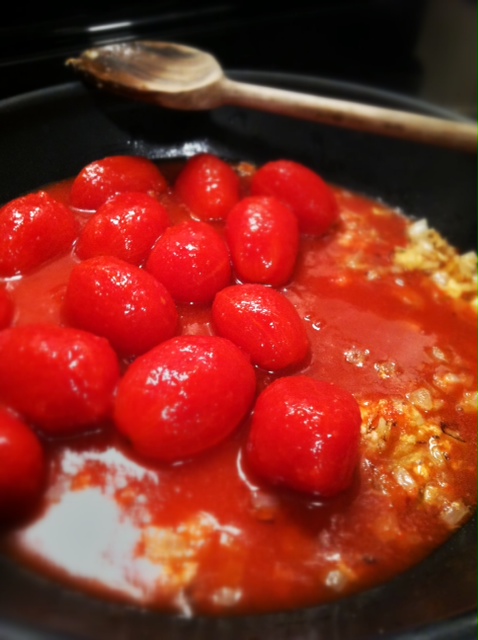 Saute onion in a large skillet. To that, add whole tomatoes.