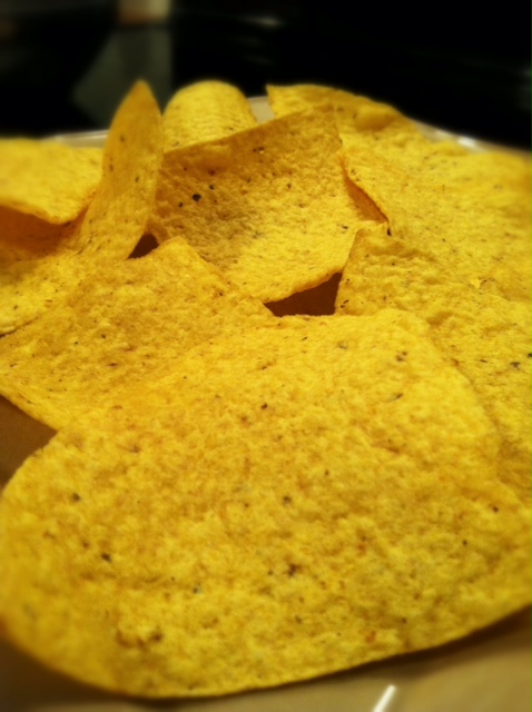 Arrange some large good quality tortilla chips on a plate. You want them to be large because the sauce will sort of soften part of the chip (in a good way) and you will want to fold them while you’re eating. Trust me.