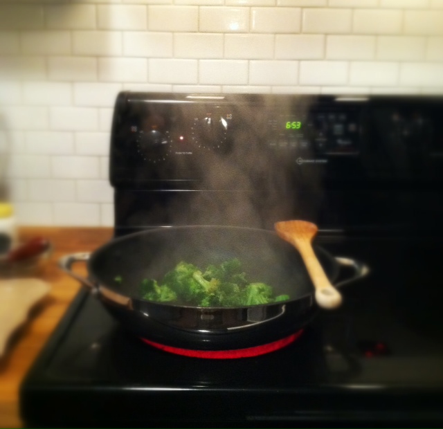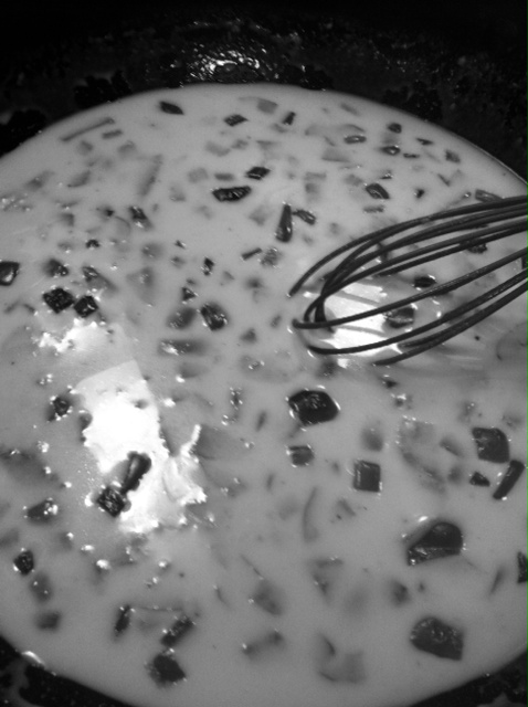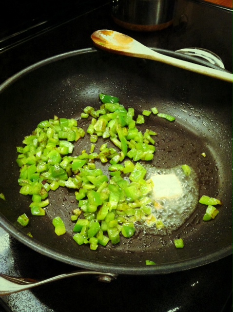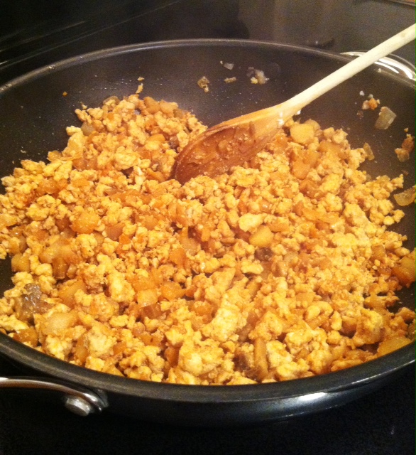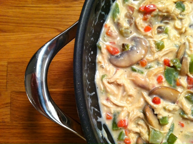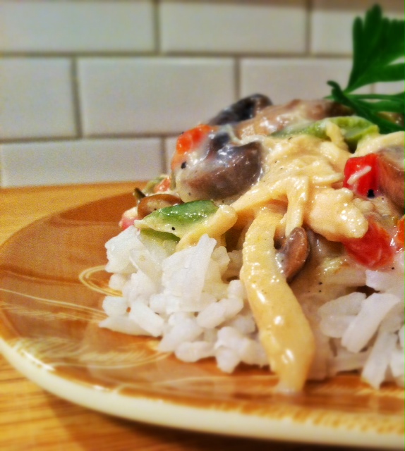 In addition to the chicken and onion, we have diced mushrooms and water chestnuts (which this recipe “requires” and I am in favor of, but usually am not a fan).