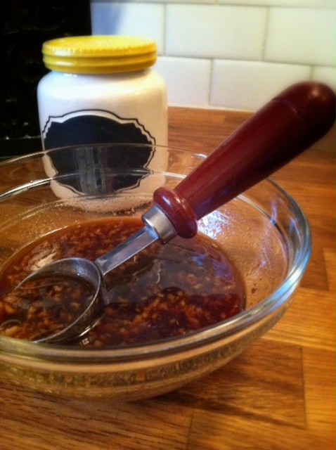 combine 1/4 cup soy, 1/4 cup hoisin sauce, 1 tablespoon rice vinegar, 1 teaspoon sesame oil, 1 tablespoon sriracha and 2 minced garlic cloves in a small bowl and set aside.
